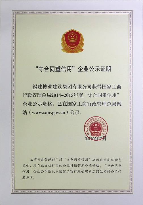 2014-2015年度守合同重信用企业公示证明